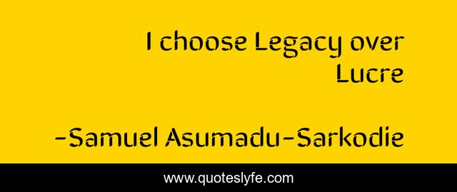 This page presents the quote "I choose Legacy over Lucre". Author of this quote is Samuel Asumadu-Sarkodie. This quote is about proverbs, words-of-knowledge, discernment, parables, words-of-wisdom, inspiration,.