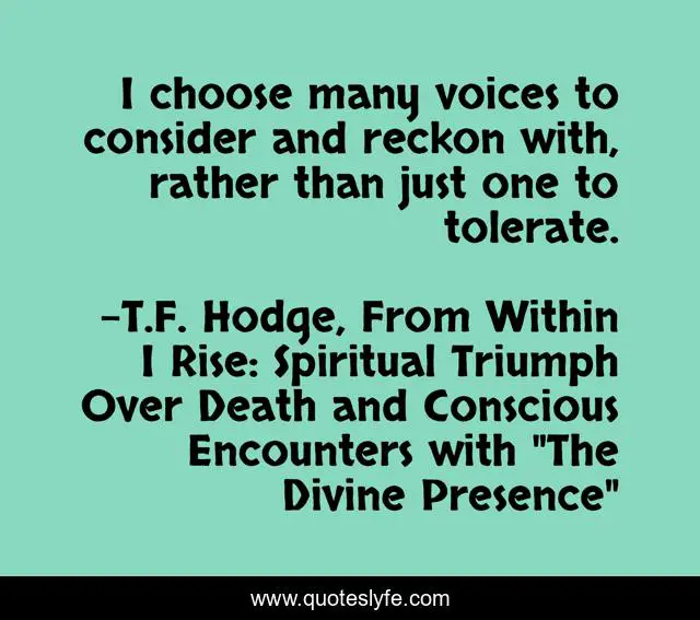 "T.F. Hodge, From Within I Rise: Spiritual Triumph Over Death and Conscious Encounters with "The Divine Presence" Quotes." Quoteslyfe.com, 2025. Mon. 15 Dec. 2025. <https://www.quoteslyfe.com/quote/I-choose-many-voices-to-consider-and-22181>.