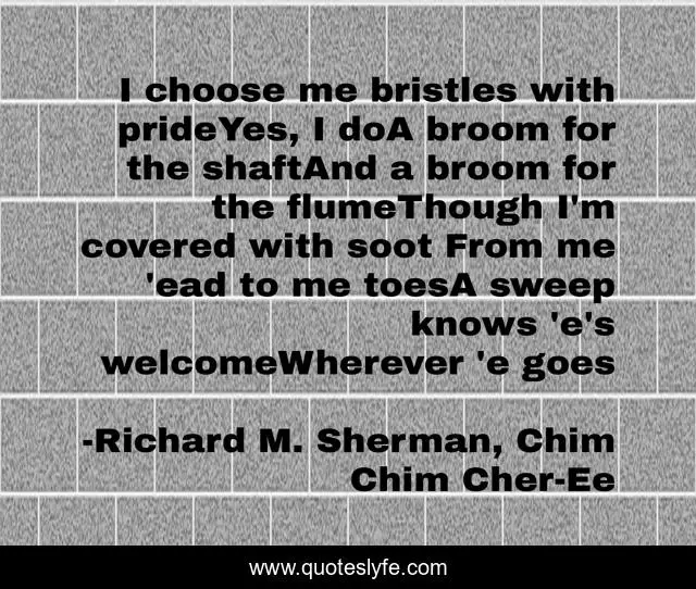 This page presents the quote "I choose me bristles with prideYes, I doA broom for the shaftAnd a broom for the flumeThough I'm covered with soot From me 'ead to me toesA sweep knows 'e's welcomeWherever 'e goes". Author of this quote is Richard M. Sherman, Chim Chim Cher-Ee. This quote is about vocation, work, calling,.