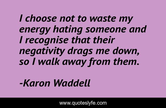 This page presents the quote "I choose not to waste my energy hating someone and I recognise that their negativity drags me down, so I walk away from them.". Author of this quote is Karon Waddell. This quote is about self-love, positive-thinking, quotes, self-improvement, quotes-about-life, positive-thoughts, quotes-to-live-by, positive-thoughts-and-beliefs,.