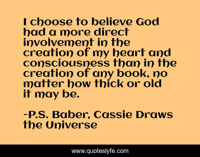 This page presents the quote "I choose to believe God had a more direct involvement in the creation of my heart and consciousness than in the creation of any book, no matter how thick or old it may be.". Author of this quote is P.S. Baber, Cassie Draws the Universe. This quote is about god, bible, heart,.