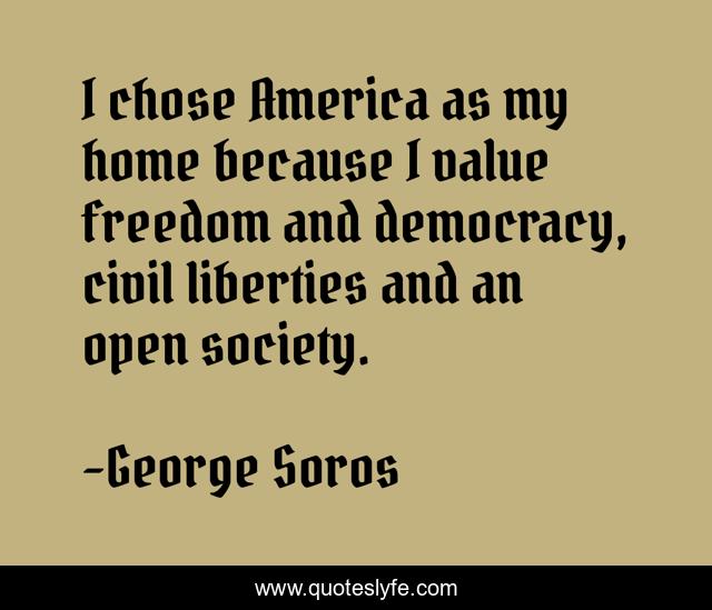 This page presents the quote "I chose America as my home because I value freedom and democracy, civil liberties and an open society.". Author of this quote is George Soros. This quote is about freedom, america, society,.