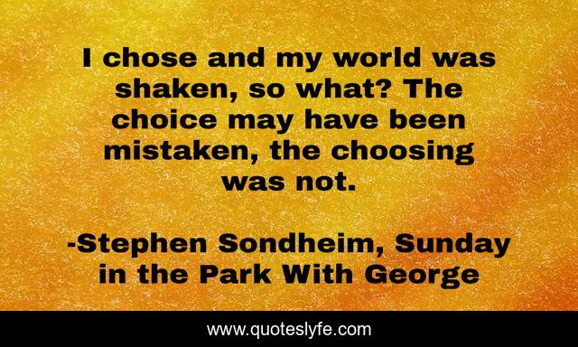 This page presents the quote "I chose and my world was shaken, so what? The choice may have been mistaken, the choosing was not.". Author of this quote is Stephen Sondheim, Sunday in the Park With George. This quote is about choice, musicals, sondheim,.