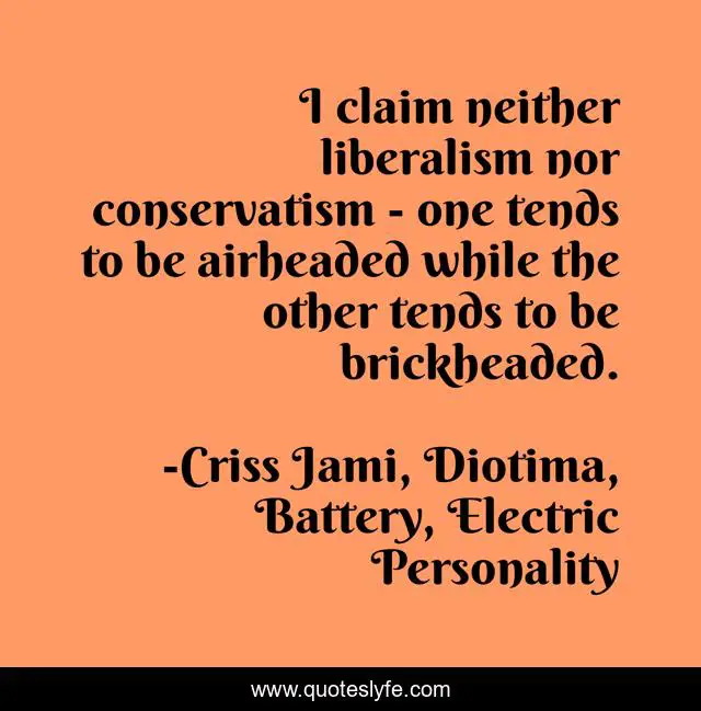 This page presents the quote "I claim neither liberalism nor conservatism - one tends to be airheaded while the other tends to be brickheaded.". Author of this quote is Criss Jami, Diotima, Battery, Electric Personality. This quote is about funny, brickheads, conservatism, comedy, airheads, liberalism,.