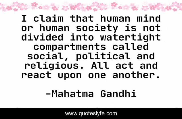 This page presents the quote "I claim that human mind or human society is not divided into watertight compartments called social, political and religious. All act and react upon one another.". Author of this quote is Mahatma Gandhi. This quote is about mind, political, human,.
