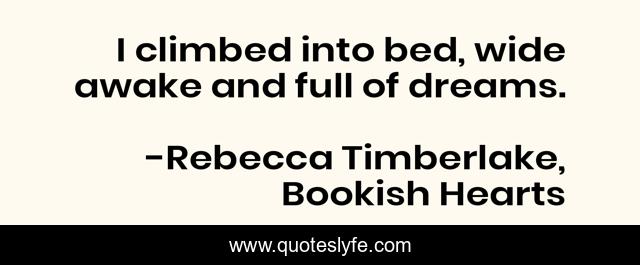 This page presents the quote "I climbed into bed, wide awake and full of dreams.". Author of this quote is Rebecca Timberlake, Bookish Hearts. This quote is about bed, enthusiasm, dreams, inspirational, optimistic,.
