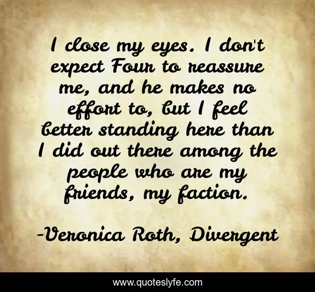 This page presents the quote "I close my eyes. I don't expect Four to reassure me, and he makes no effort to, but I feel better standing here than I did out there among the people who are my friends, my faction.". Author of this quote is Veronica Roth, Divergent. This quote is about comfort, friends,.