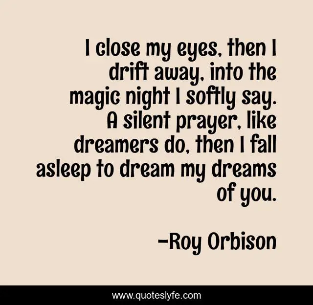 This page presents the quote "I close my eyes, then I drift away, into the magic night I softly say. A silent prayer, like dreamers do, then I fall asleep to dream my dreams of you.". Author of this quote is Roy Orbison. .