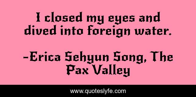 This page presents the quote "I closed my eyes and dived into foreign water.". Author of this quote is Erica Sehyun Song, The Pax Valley. This quote is about fictions, fantasy-fiction, fantasy, fiction-writing, fiction-fantasy, adventures, fictional, fiction, fiction-novel,.