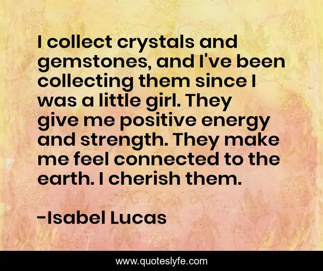 This page presents the quote "I collect crystals and gemstones, and I've been collecting them since I was a little girl. They give me positive energy and strength. They make me feel connected to the earth. I cherish them.". Author of this quote is Isabel Lucas. This quote is about me, positive, girl, confidence,.