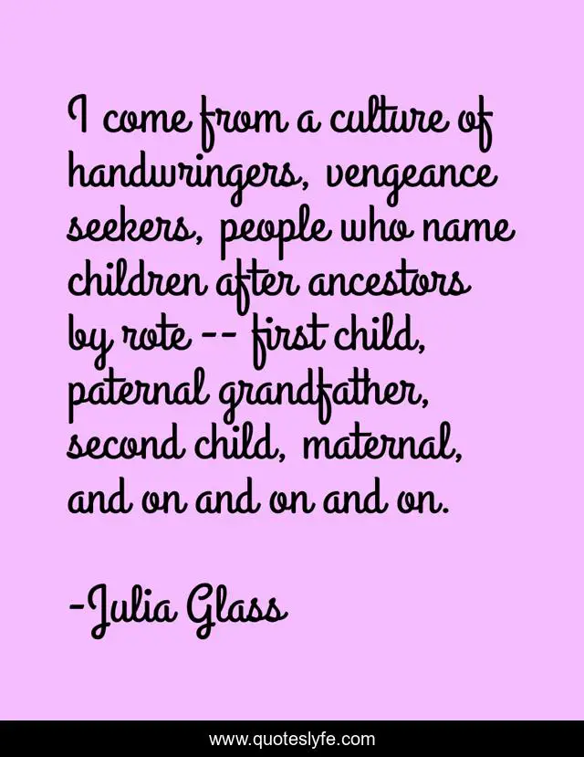 This page presents the quote "I come from a culture of handwringers, vengeance seekers, people who name children after ancestors by rote -- first child, paternal grandfather, second child, maternal, and on and on and on.". Author of this quote is Julia Glass. This quote is about culture, names,.