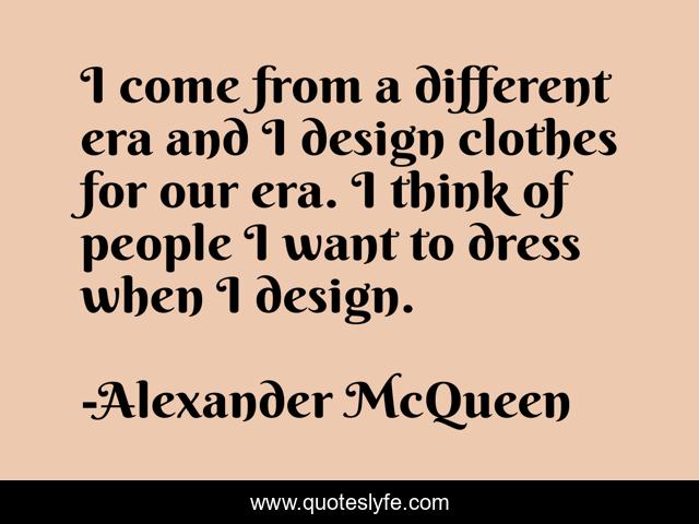This page presents the quote "I come from a different era and I design clothes for our era. I think of people I want to dress when I design.". Author of this quote is Alexander McQueen. This quote is about dress, people,.