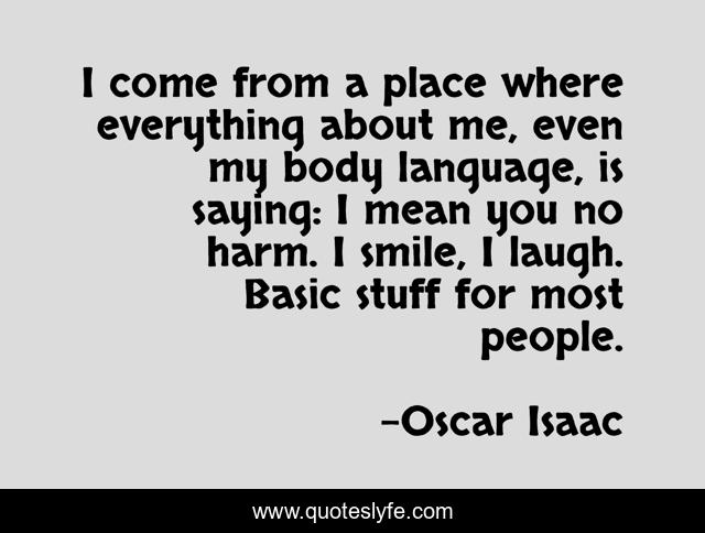 This page presents the quote "I come from a place where everything about me, even my body language, is saying: I mean you no harm. I smile, I laugh. Basic stuff for most people.". Author of this quote is Oscar Isaac. This quote is about me, language, laugh,.