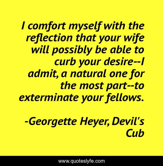 This page presents the quote "I comfort myself with the reflection that your wife will possibly be able to curb your desire--I admit, a natural one for the most part--to exterminate your fellows.". Author of this quote is Georgette Heyer, Devil's Cub. .