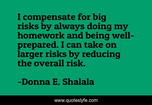 This page presents the quote "I compensate for big risks by always doing my homework and being well-prepared. I can take on larger risks by reducing the overall risk.". Author of this quote is Donna E. Shalala. .