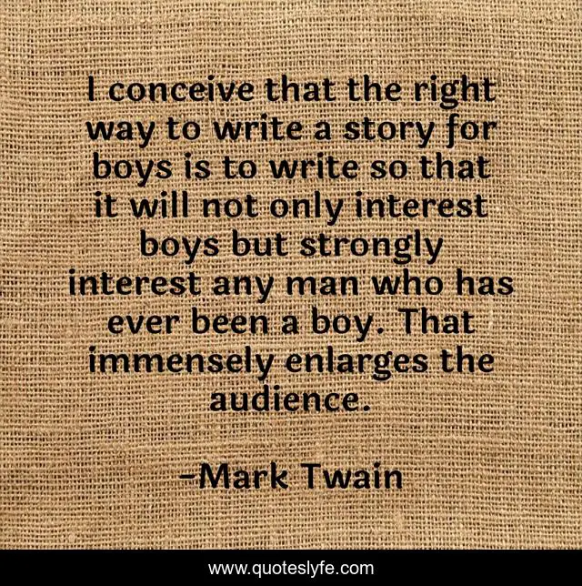 This page presents the quote "I conceive that the right way to write a story for boys is to write so that it will not only interest boys but strongly interest any man who has ever been a boy. That immensely enlarges the audience.". Author of this quote is Mark Twain. This quote is about writers, writing,.