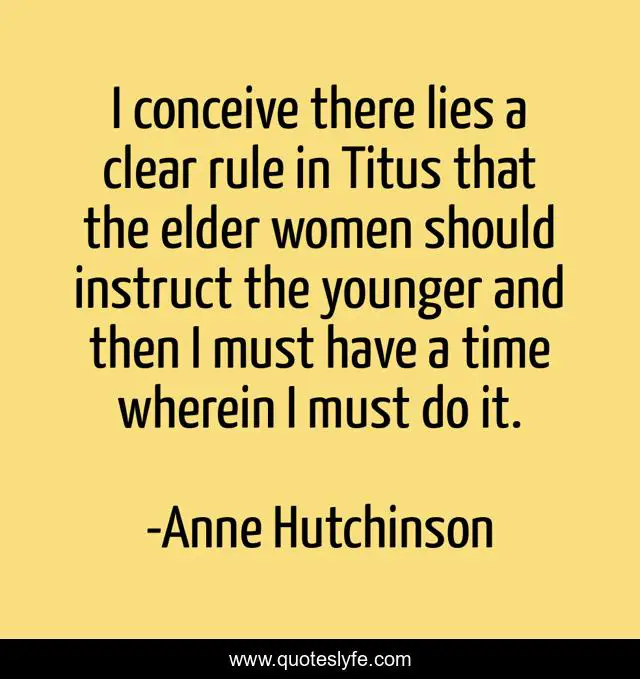 This page presents the quote "I conceive there lies a clear rule in Titus that the elder women should instruct the younger and then I must have a time wherein I must do it.". Author of this quote is Anne Hutchinson. This quote is about younger, time,.
