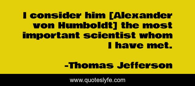 This page presents the quote "I consider him [Alexander von Humboldt] the most important scientist whom I have met.". Author of this quote is Thomas Jefferson. This quote is about admiration, alexander-von-humboldt, scientist, praise, honor, recognition, humboldt,.