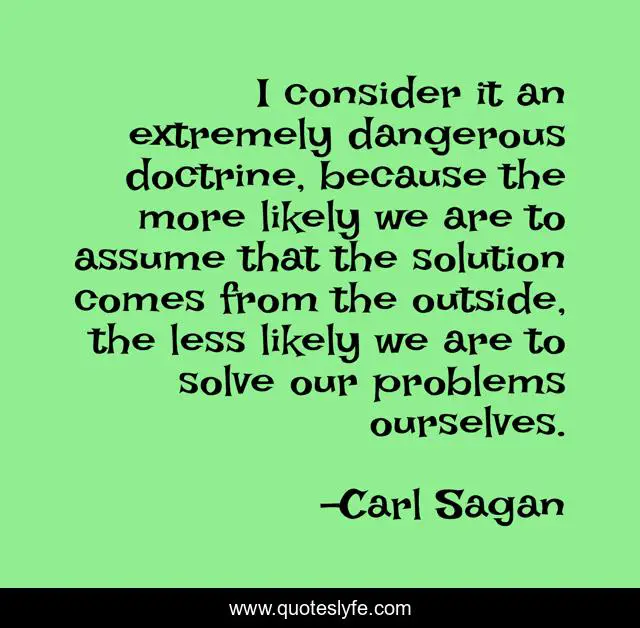 This page presents the quote "I consider it an extremely dangerous doctrine, because the more likely we are to assume that the solution comes from the outside, the less likely we are to solve our problems ourselves.". Author of this quote is Carl Sagan. This quote is about religion, philosophy, science,.