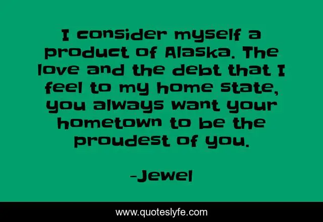 This page presents the quote "I consider myself a product of Alaska. The love and the debt that I feel to my home state, you always want your hometown to be the proudest of you.". Author of this quote is Jewel. This quote is about myself, love, affection,.