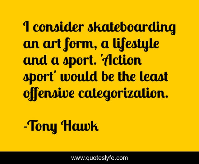 This page presents the quote "I consider skateboarding an art form, a lifestyle and a sport. 'Action sport' would be the least offensive categorization.". Author of this quote is Tony Hawk. This quote is about action, lifestyle,.