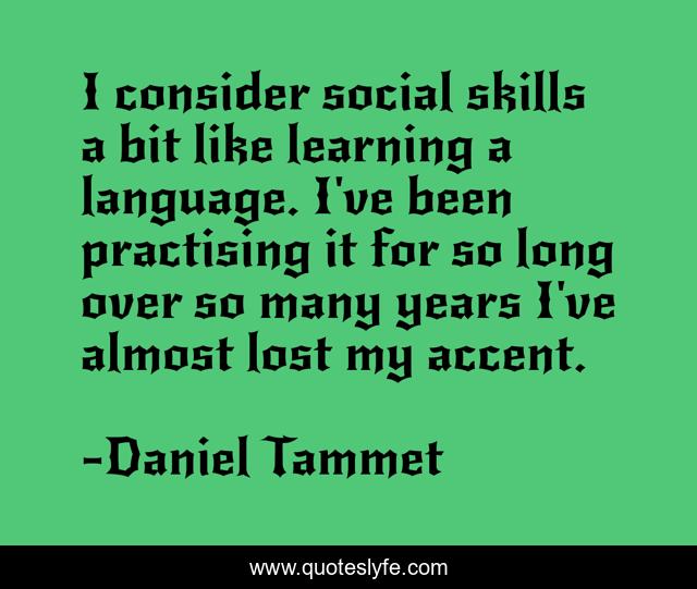 This page presents the quote "I consider social skills a bit like learning a language. I've been practising it for so long over so many years I've almost lost my accent.". Author of this quote is Daniel Tammet. This quote is about language, lost, long,.