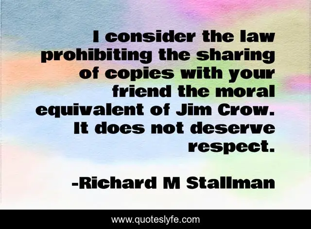 This page presents the quote "I consider the law prohibiting the sharing of copies with your friend the moral equivalent of Jim Crow. It does not deserve respect.". Author of this quote is Richard M Stallman. This quote is about free-software, ethics, hacking,.