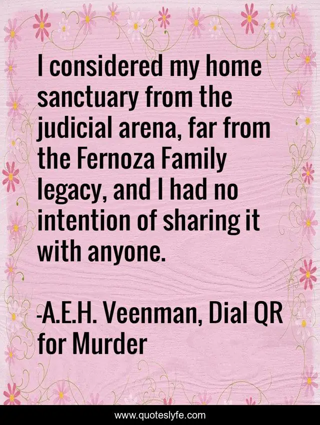 This page presents the quote "I considered my home sanctuary from the judicial arena, far from the Fernoza Family legacy, and I had no intention of sharing it with anyone.". Author of this quote is A.E.H. Veenman, Dial QR for Murder. This quote is about mystery, sleuth, digitalagecozy, cozy-mystery-writer,.