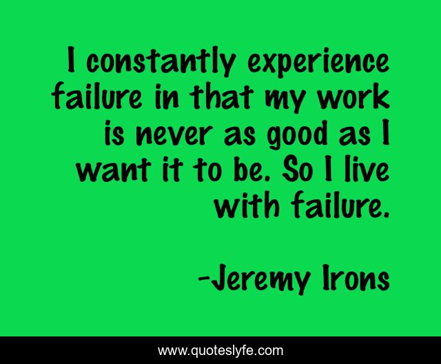This page presents the quote "I constantly experience failure in that my work is never as good as I want it to be. So I live with failure.". Author of this quote is Jeremy Irons. This quote is about work, good, experience,.