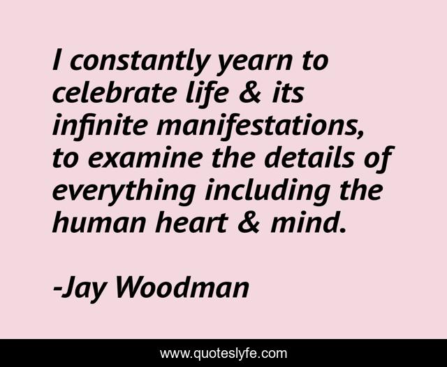This page presents the quote "I constantly yearn to celebrate life & its infinite manifestations, to examine the details of everything including the human heart & mind.". Author of this quote is Jay Woodman. This quote is about heart, life, philosophy, mind, manifestations, condition, celebrate,.