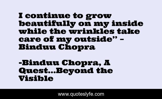 This page presents the quote "I continue to grow beautifully on my inside while the wrinkles take care of my outside’’ – Binduu Chopra". Author of this quote is Binduu Chopra, A Quest...Beyond the Visible. This quote is about spiritual, binduu-chopra, saroj, make-me-like-you, rajinder, tanzania,.