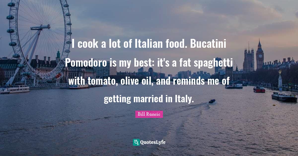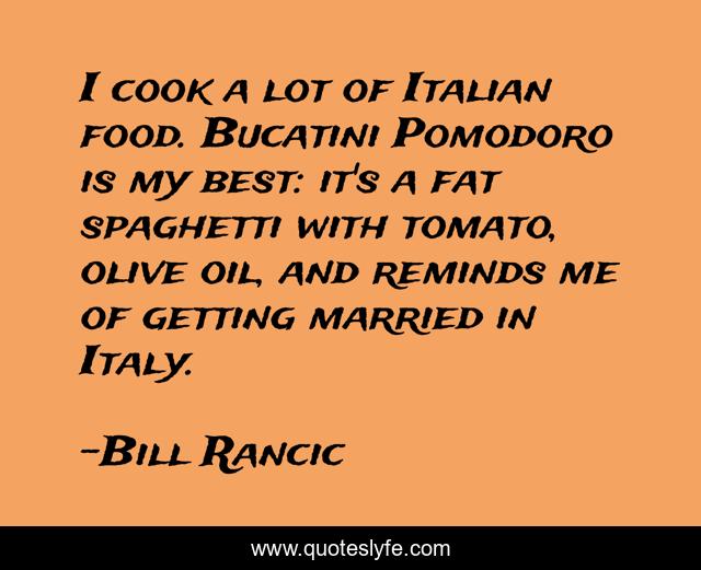 This page presents the quote "I cook a lot of Italian food. Bucatini Pomodoro is my best: it's a fat spaghetti with tomato, olive oil, and reminds me of getting married in Italy.". Author of this quote is Bill Rancic. This quote is about me, best, fat,.