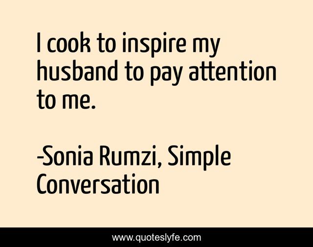 This page presents the quote "I cook to inspire my husband to pay attention to me.". Author of this quote is Sonia Rumzi, Simple Conversation. This quote is about attention, cooking, husband,.