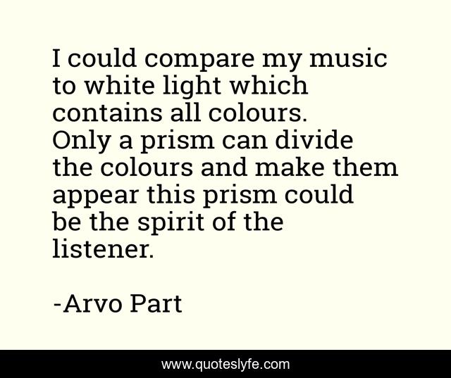 This page presents the quote "I could compare my music to white light which contains all colours. Only a prism can divide the colours and make them appear this prism could be the spirit of the listener.". Author of this quote is Arvo Part. This quote is about light, white, spirit,.
