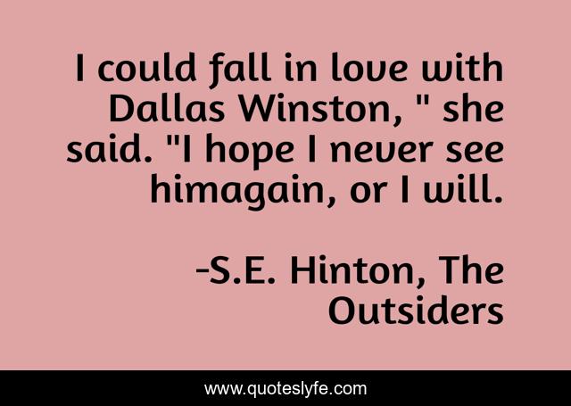 This page presents the quote "I could fall in love with Dallas Winston, " she said. "I hope I never see himagain, or I will.". Author of this quote is S.E. Hinton, The Outsiders. .