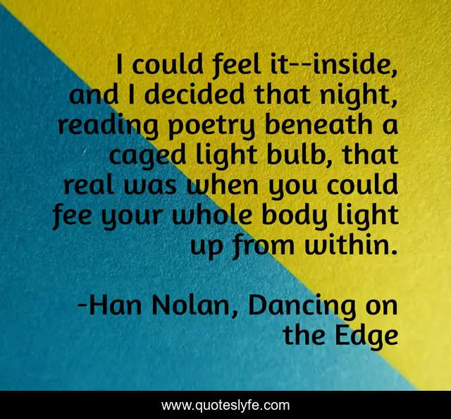 This page presents the quote "I could feel it--inside, and I decided that night, reading poetry beneath a caged light bulb, that real was when you could fee your whole body light up from within.". Author of this quote is Han Nolan, Dancing on the Edge. This quote is about life, reading,.