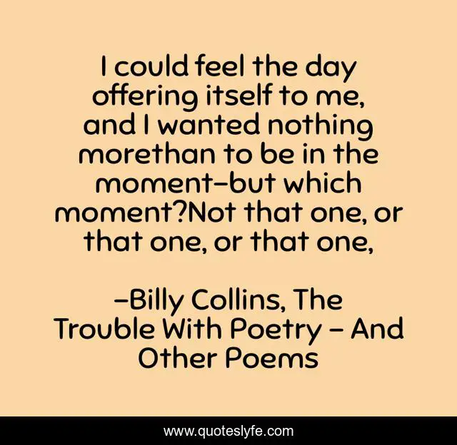 This page presents the quote "I could feel the day offering itself to me, and I wanted nothing morethan to be in the moment-but which moment?Not that one, or that one, or that one, ". Author of this quote is Billy Collins, The Trouble With Poetry - And Other Poems. .
