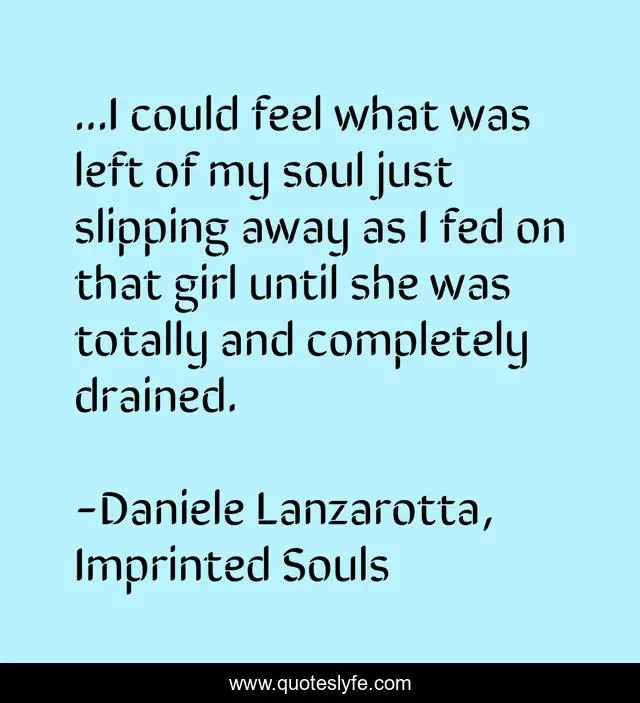 This page presents the quote "...I could feel what was left of my soul just slipping away as I fed on that girl until she was totally and completely drained.". Author of this quote is Daniele Lanzarotta, Imprinted Souls. This quote is about imprinted-souls, imprinted-souls-series, vampire,.