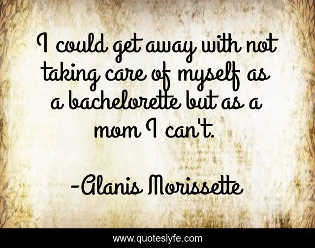 This page presents the quote "I could get away with not taking care of myself as a bachelorette but as a mom I can't.". Author of this quote is Alanis Morissette. This quote is about myself, away, care,.