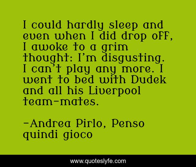 This page presents the quote "I could hardly sleep and even when I did drop off, I awoke to a grim thought: I’m disgusting. I can’t play any more. I went to bed with Dudek and all his Liverpool team-mates.". Author of this quote is Andrea Pirlo, Penso quindi gioco. This quote is about memories, defeat, trauma, inconsolable,.