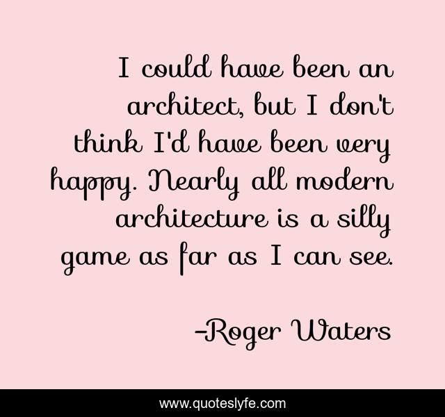 This page presents the quote "I could have been an architect, but I don't think I'd have been very happy. Nearly all modern architecture is a silly game as far as I can see.". Author of this quote is Roger Waters. This quote is about game, think, happy,.