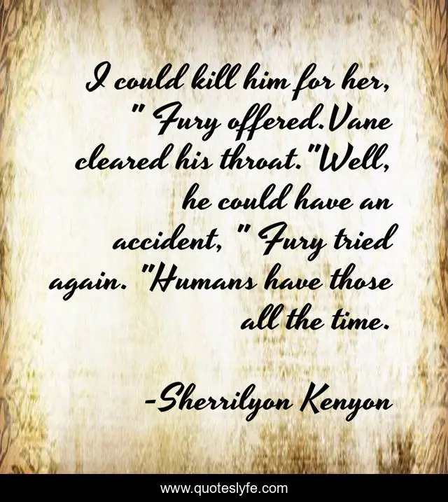 This page presents the quote "I could kill him for her, " Fury offered.Vane cleared his throat."Well, he could have an accident, " Fury tried again. "Humans have those all the time.". Author of this quote is Sherrilyon Kenyon. This quote is about mystery, fantasy, urban-fantasy-y, affection, love,.
