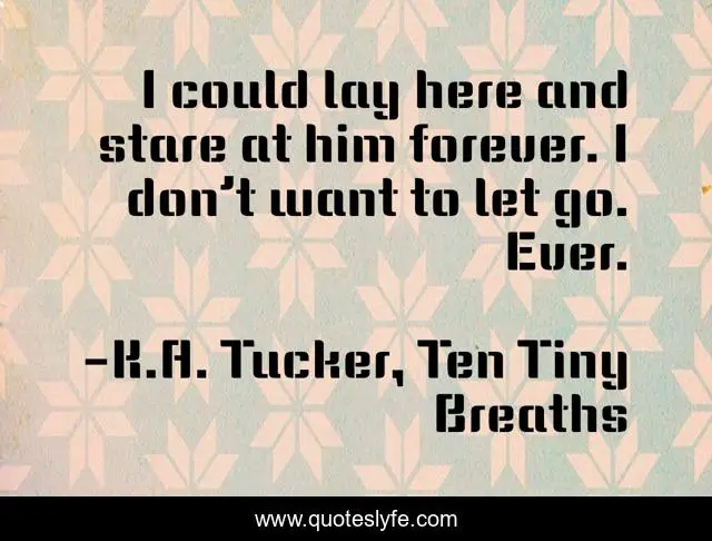 This page presents the quote "I could lay here and stare at him forever. I don’t want to let go. Ever.". Author of this quote is K.A. Tucker, Ten Tiny Breaths. This quote is about stare, forever, trent-kacey, kacey-cleary, trent-emerson, ten-tiny-breaths, k-a-tucker,.