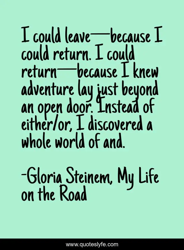 "Gloria Steinem, My Life on the Road Quotes." Quoteslyfe.com, 2025. Fri. 05 Dec. 2025. <https://www.quoteslyfe.com/quote/I-could-leave-because-I-could-return-137126>.