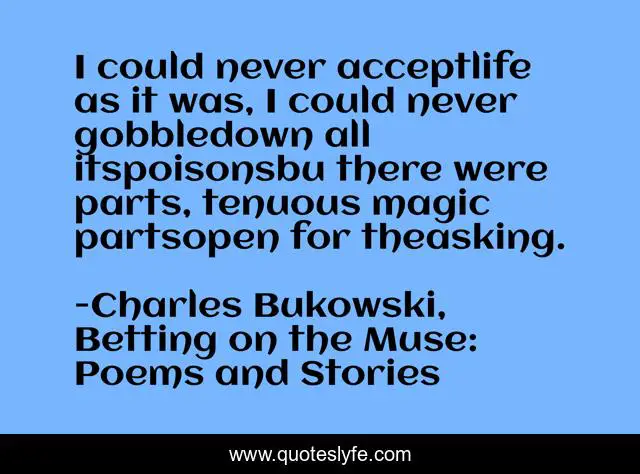 "Charles Bukowski, Betting on the Muse: Poems and Stories Quotes." Quoteslyfe.com, 2025. Mon. 08 Dec. 2025. <https://www.quoteslyfe.com/quote/I-could-never-acceptlife-as-it-was-134136>.