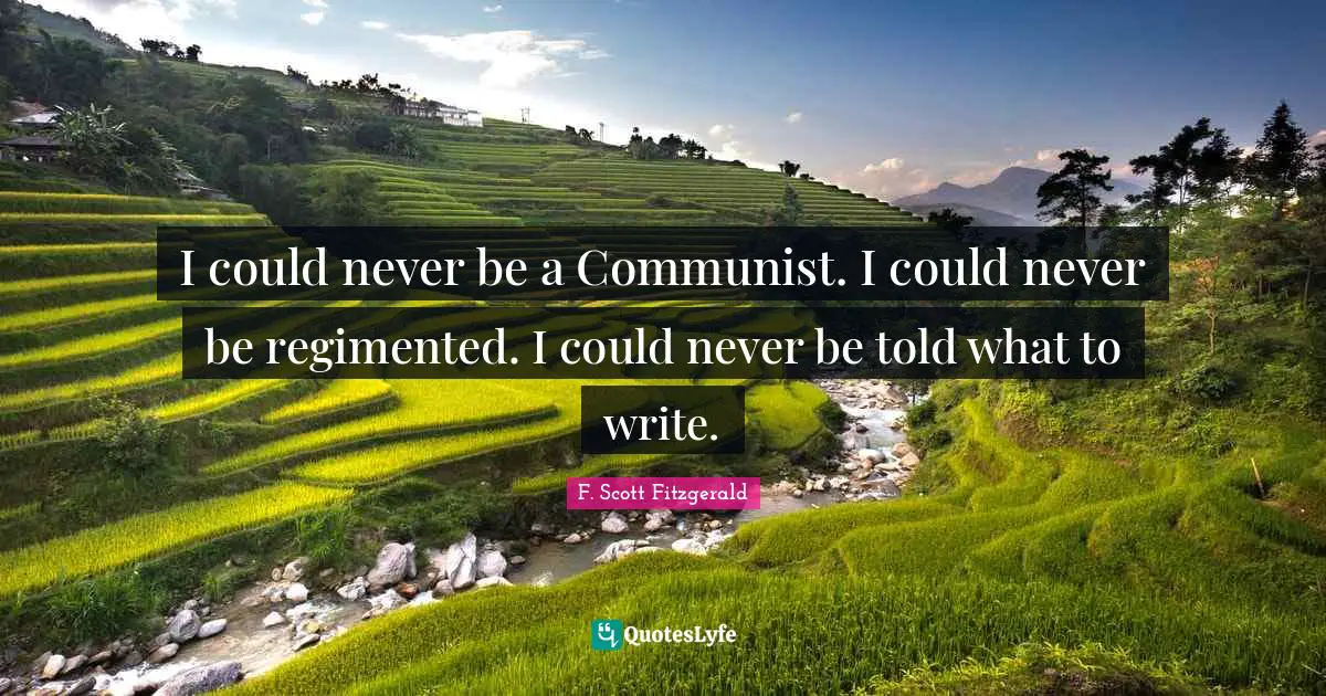 This page presents the quote "I could never be a Communist. I could never be regimented. I could never be told what to write.". Author of this quote is F. Scott Fitzgerald. This quote is about censorship, communism, art, fscottfitzgerald, creativity, writer, fitzgerald, anticommunist, writing,.