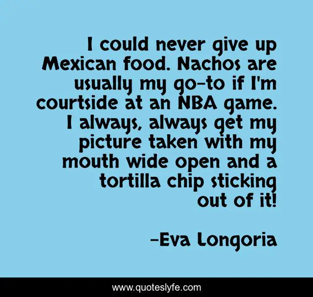 This page presents the quote "I could never give up Mexican food. Nachos are usually my go-to if I'm courtside at an NBA game. I always, always get my picture taken with my mouth wide open and a tortilla chip sticking out of it!". Author of this quote is Eva Longoria. This quote is about game, mexican, never give up,.