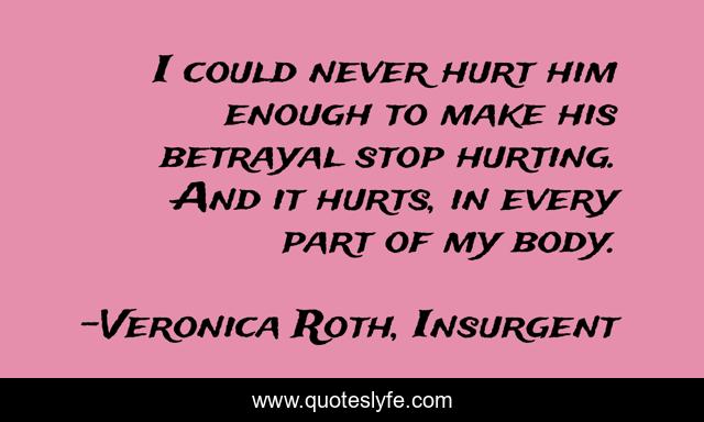 This page presents the quote "I could never hurt him enough to make his betrayal stop hurting. And it hurts, in every part of my body.". Author of this quote is Veronica Roth, Insurgent. This quote is about betrayal, trust, pain, hurt,.