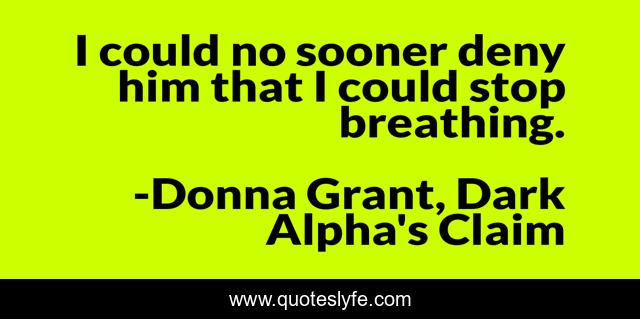 This page presents the quote "I could no sooner deny him that I could stop breathing.". Author of this quote is Donna Grant, Dark Alpha's Claim. This quote is about warriors, reapers, rhi, dragon-kings, dark-kings, paranormal-romance,.