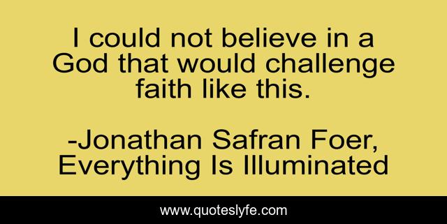 This page presents the quote "I could not believe in a God that would challenge faith like this.". Author of this quote is Jonathan Safran Foer, Everything Is Illuminated. This quote is about atheism, faith, god,.